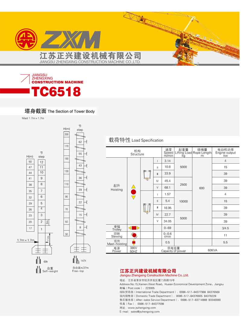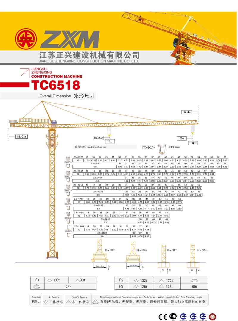 2、最大工作幅度65米,最大起重量10噸(dūn),末端最大起重量1.8噸(dūn),額(é)定起重力矩1600KN.M;