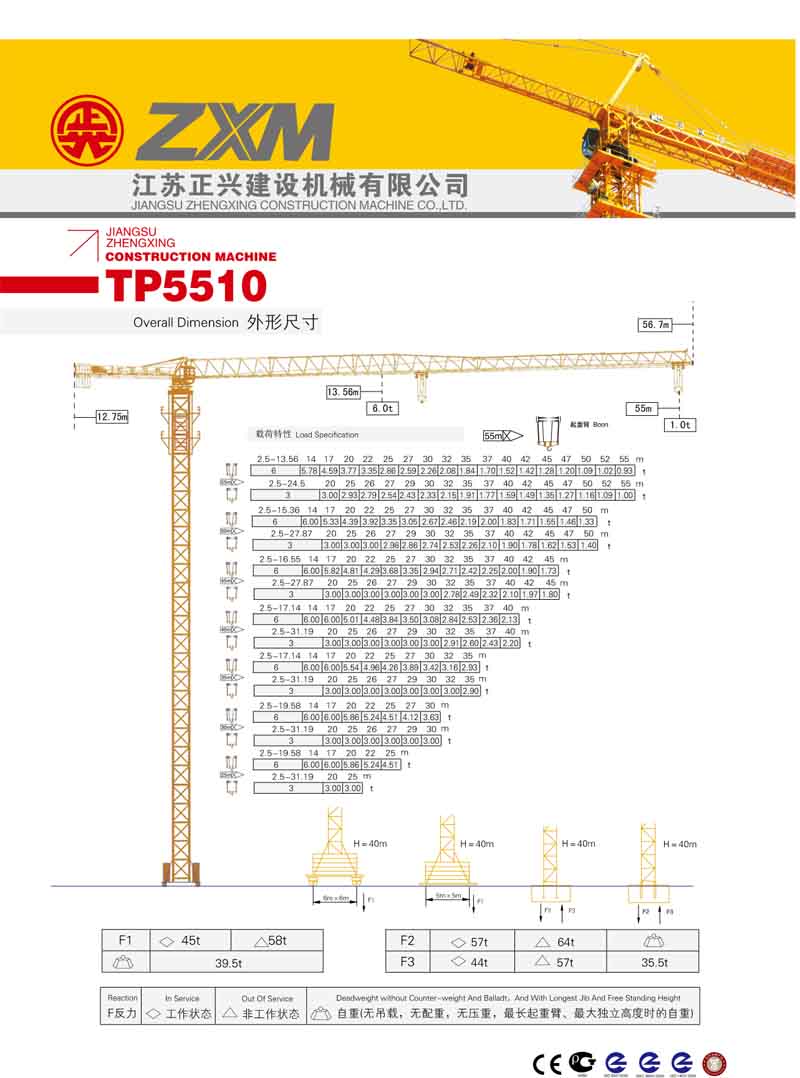 2、最大工作幅度55米,最大起重量6噸(dūn),額(é)定起重力矩630KN.M;
