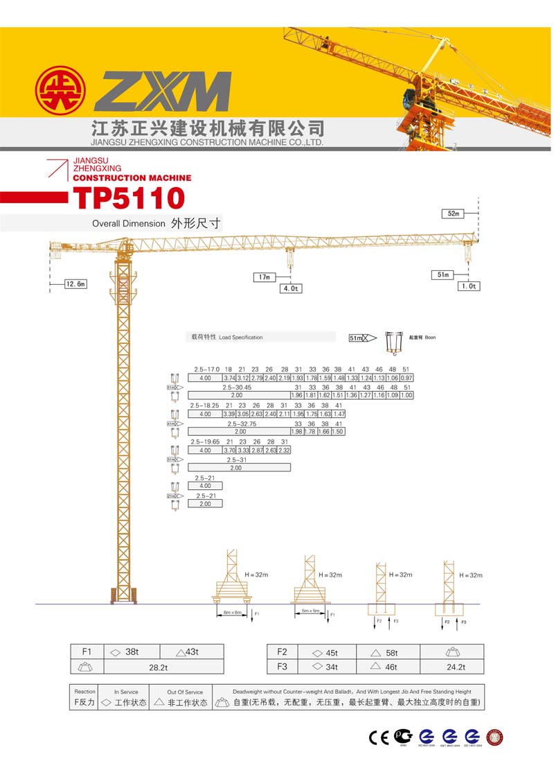 2、最大工作幅度51米,最大起重量4噸(dūn),末端最大起重量1.0噸(dūn);